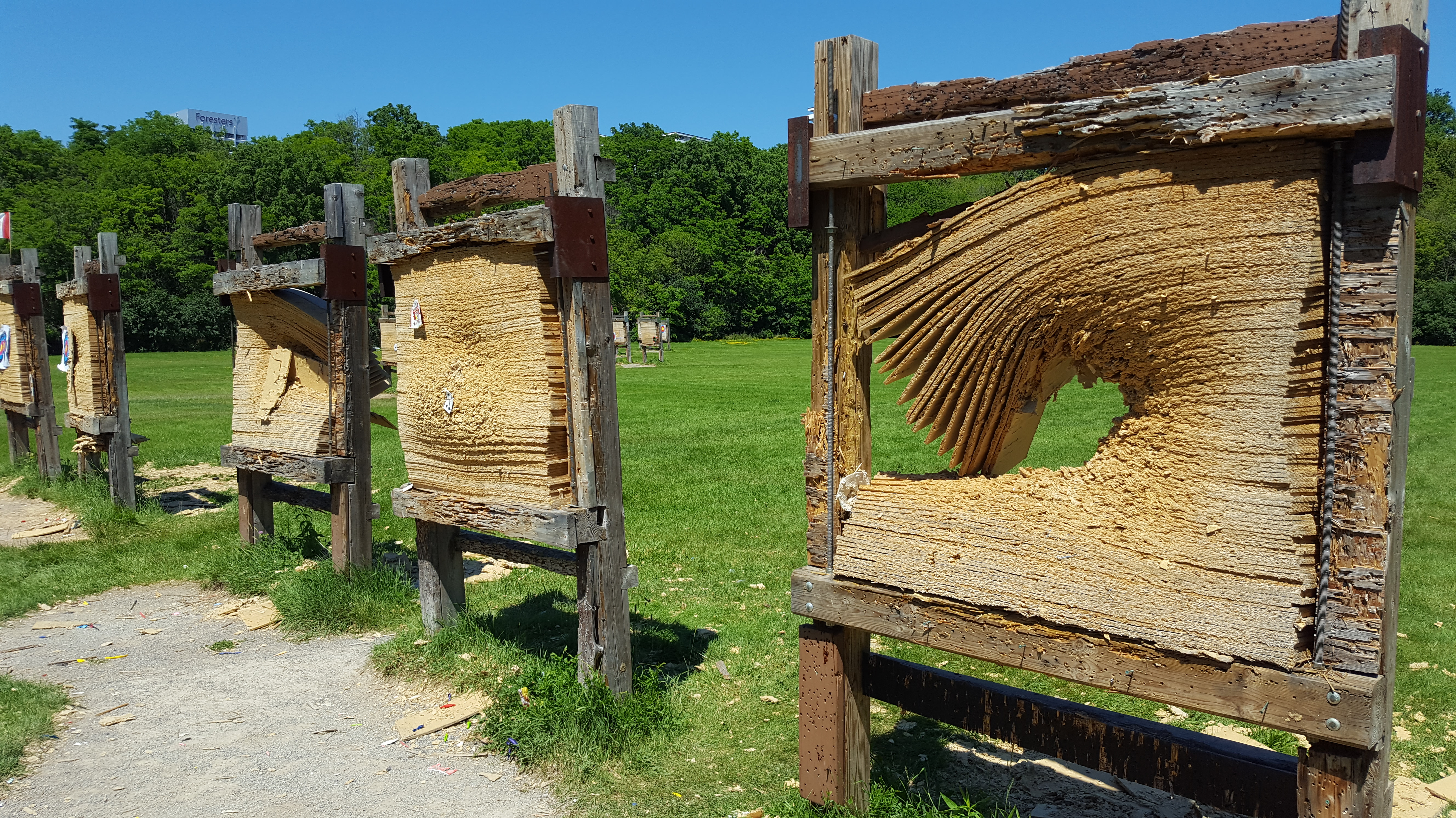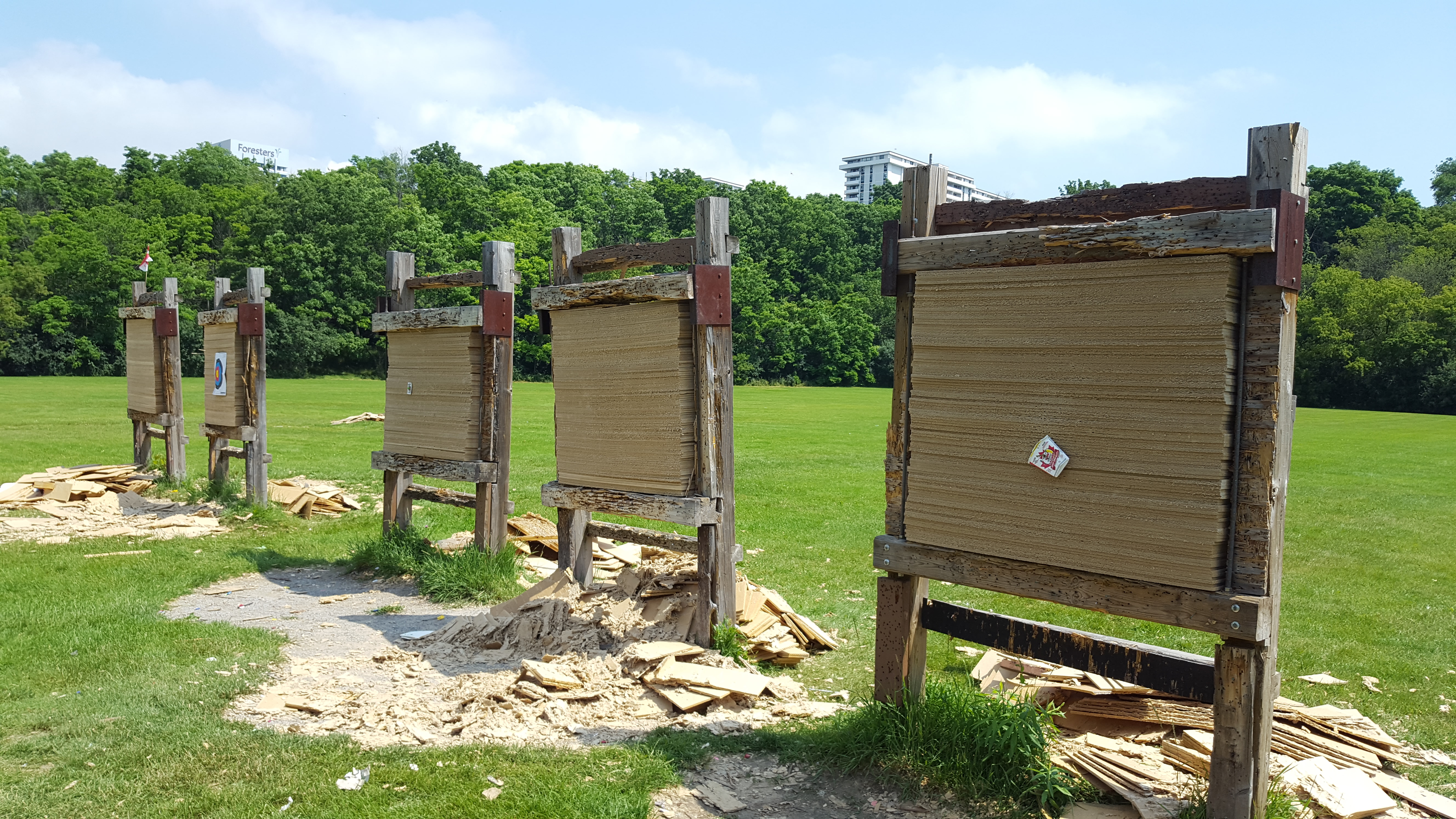 Below is a photo of the five 20-yard targets at the Toronto Archery Range. They are in pretty poor shape. We expect they will all collapse before the end of July. If you would like to see them repaired sooner, try emailing parks@toronto.ca and asking politely for the Park Staff to repair the targets.