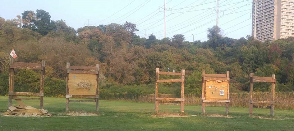 Later in May (whenever it stops raining long enough that the ground can dry) Park Staff will be installing 5 new park benches at the Toronto Archery Range. They need to wait until the ground is dry so they can install the benches and pour concrete bases for them. (They will also be repairing the signpost mentioned below on April 26th.)